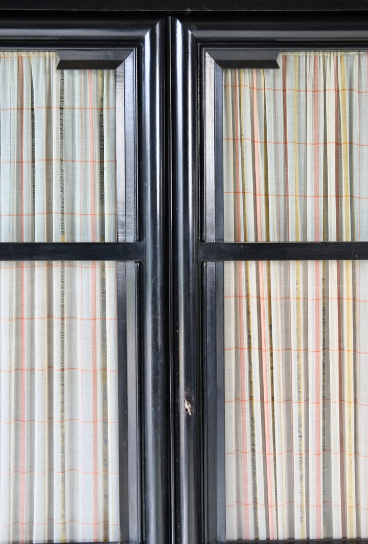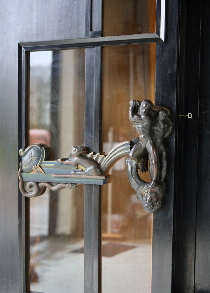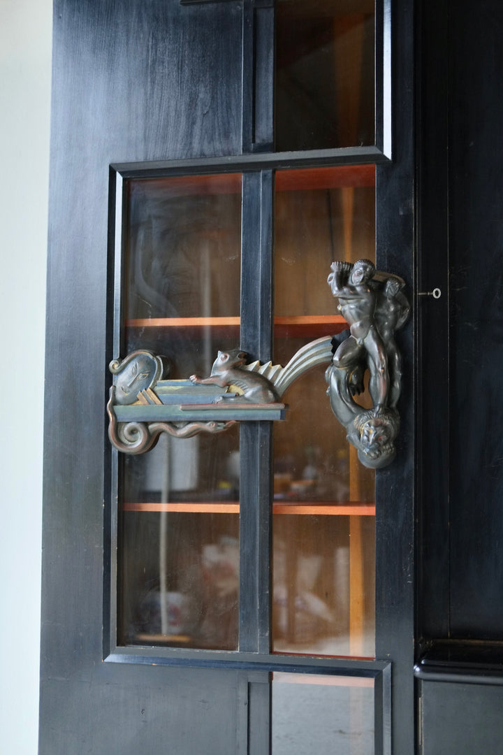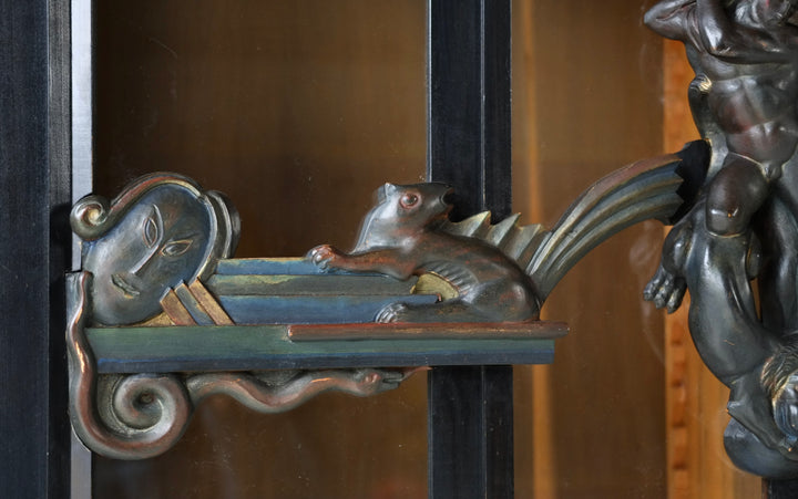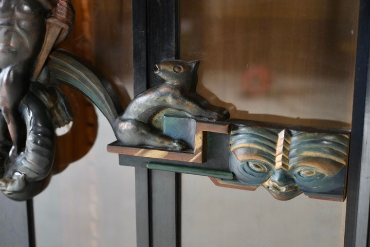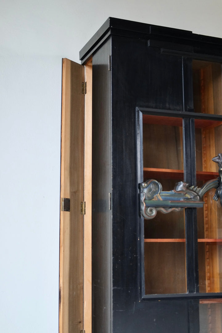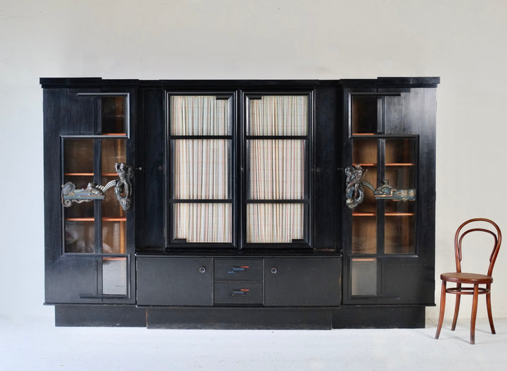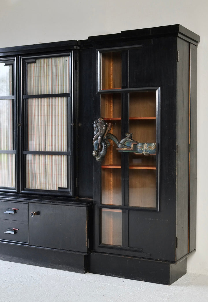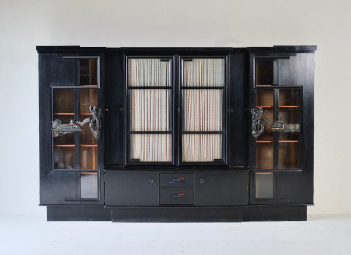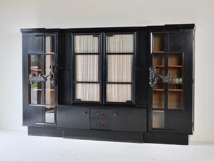 The cabinet is constructed of black-lacquered softwood and incorporates glazed central doors flanked by smaller subsidiary doors, as well as glazed side panels. The polychrome door handles are elaborately carved with figural motifs, including nudes, animals, and masks. The original locking mechanisms and keys are intact.