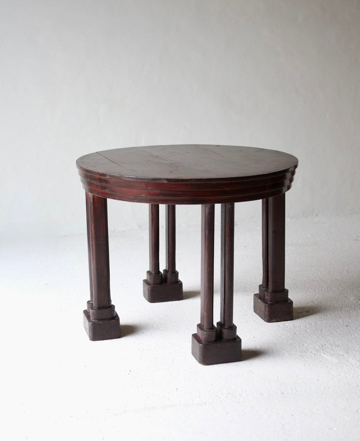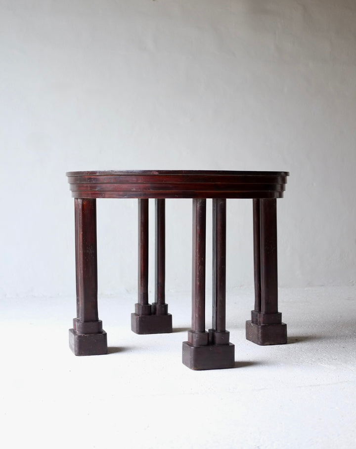 Featuring double shaft legs that rest on modernist carved oak bases and a stepped table top.