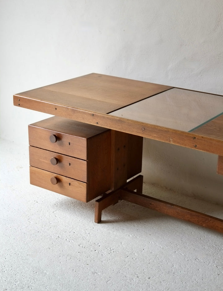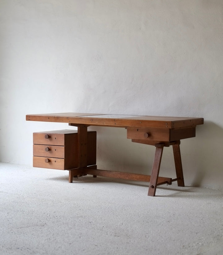 Featuring a glass desk top centre piece the desk appears to have been custom made for a craftsman.