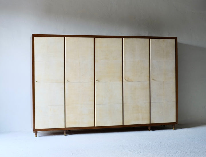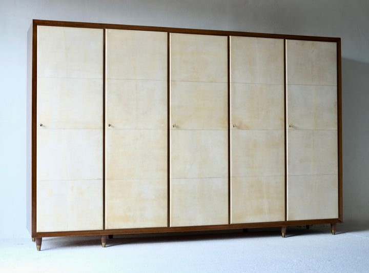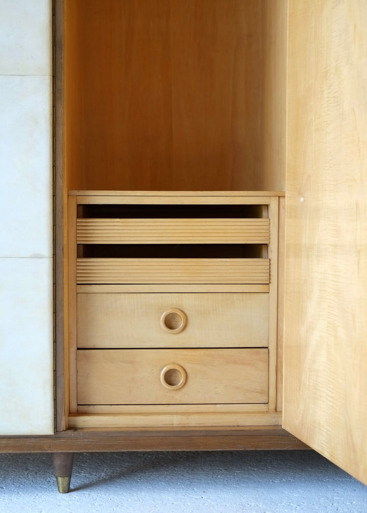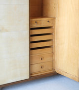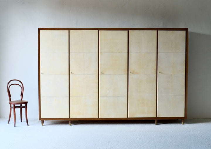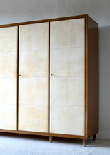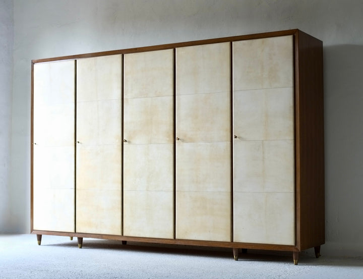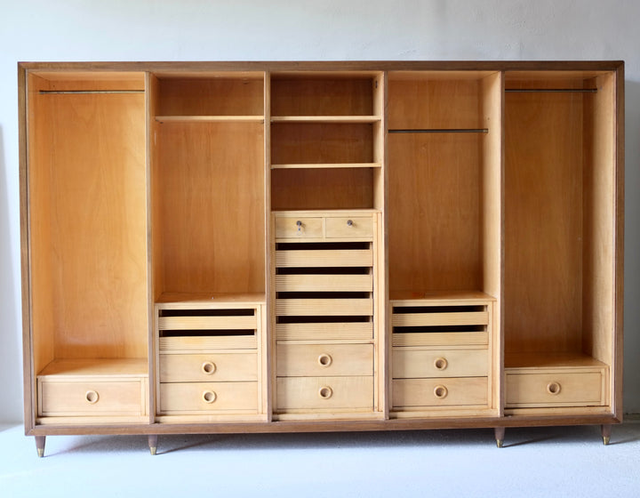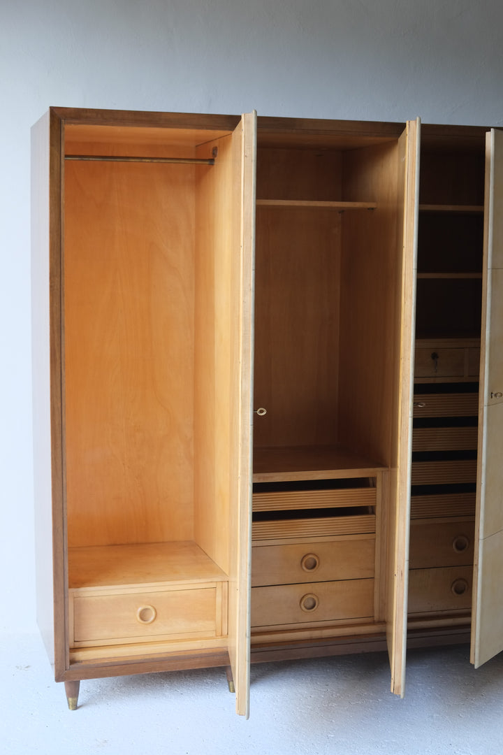 The wardrobe features numerous internal fittings including drawers, shelves and brass hanging rails. All doors have their original locking keys.