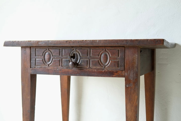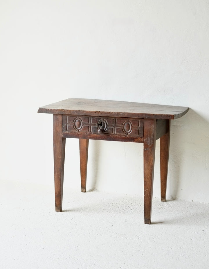 Original 18th century carved walnut draw and table top with legs which would have been added later in the 19th century.