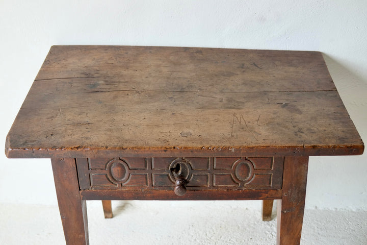 In good solid condition with no movement to the joints. Warped table top with evidence of old carvings to the top. Old dormant woodworm holes which have been treated for precaution.