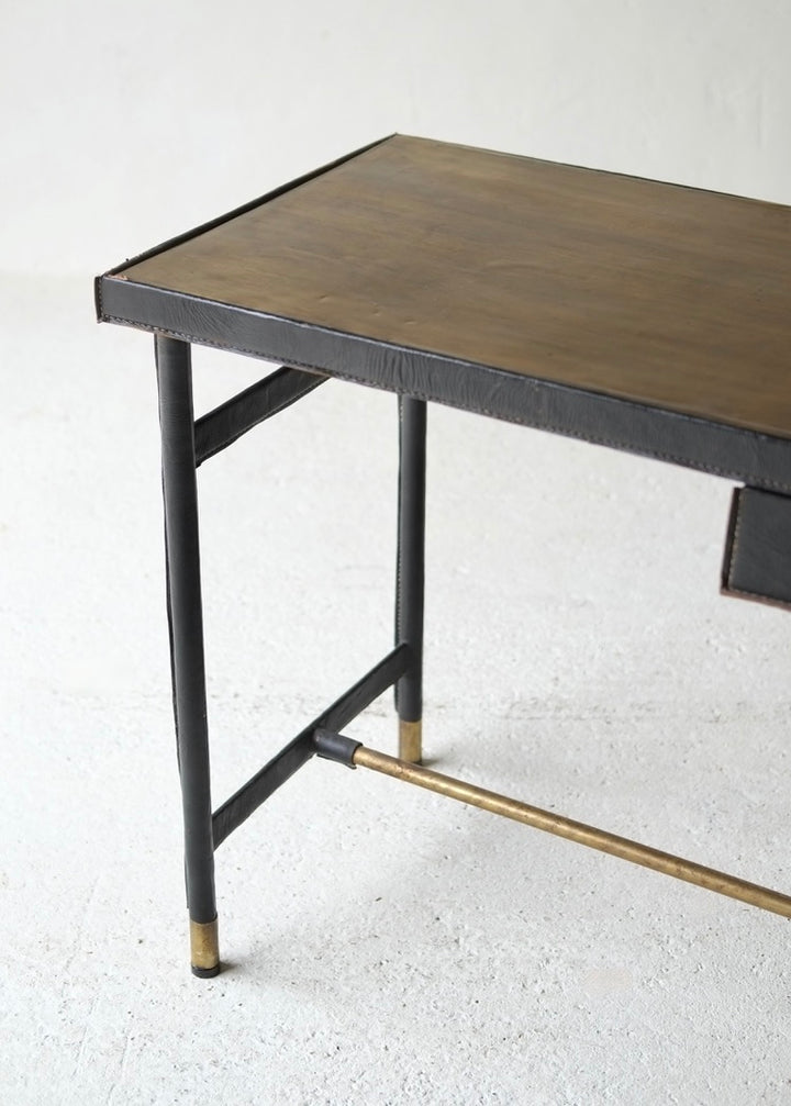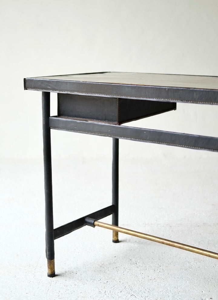 An elegant leather-clad desk with brass top and detailing, attributed to Jacques Adnet, France.